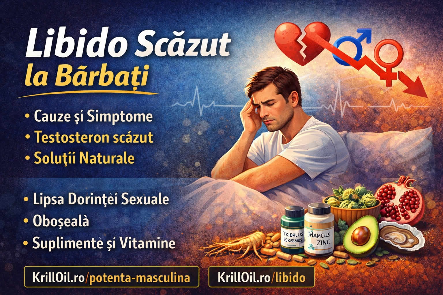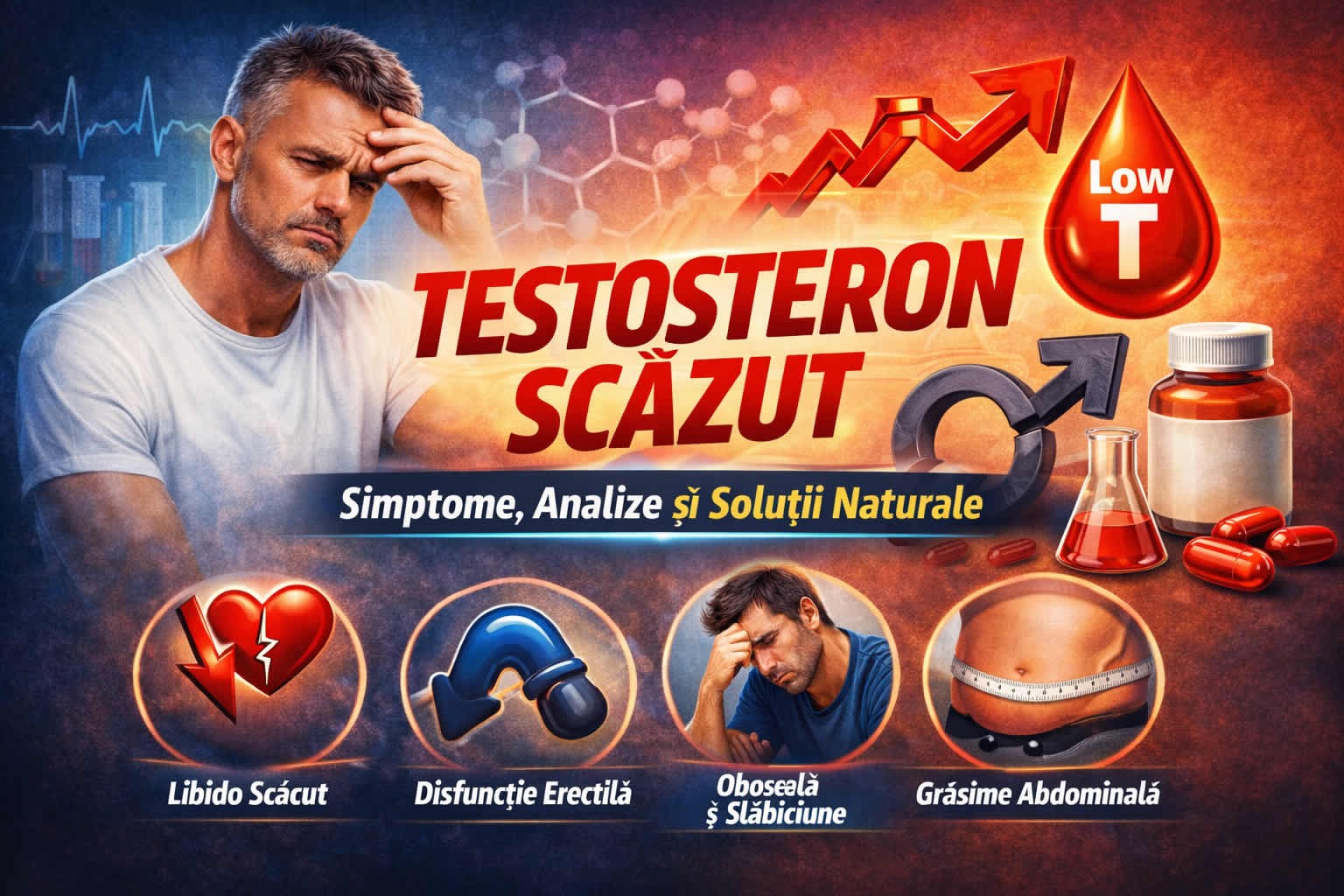 Va simtiti obosit, lenes sau va confruntati cu o lipsa de libido? Ar putea fi un semn de testosteron scazut. Testosteronul este un hormon produs de organism care este esential pentru mentinerea masei musculare, a densitatii osoase si a apetitului sexual. Pe masura ce barbatii imbatranesc, nivelul de testosteron incepe sa scada in mod natural, dar exista si alti factori care pot contribui la un nivel scazut de testosteron, inclusiv obezitatea, stresul si anumite afectiuni medicale.