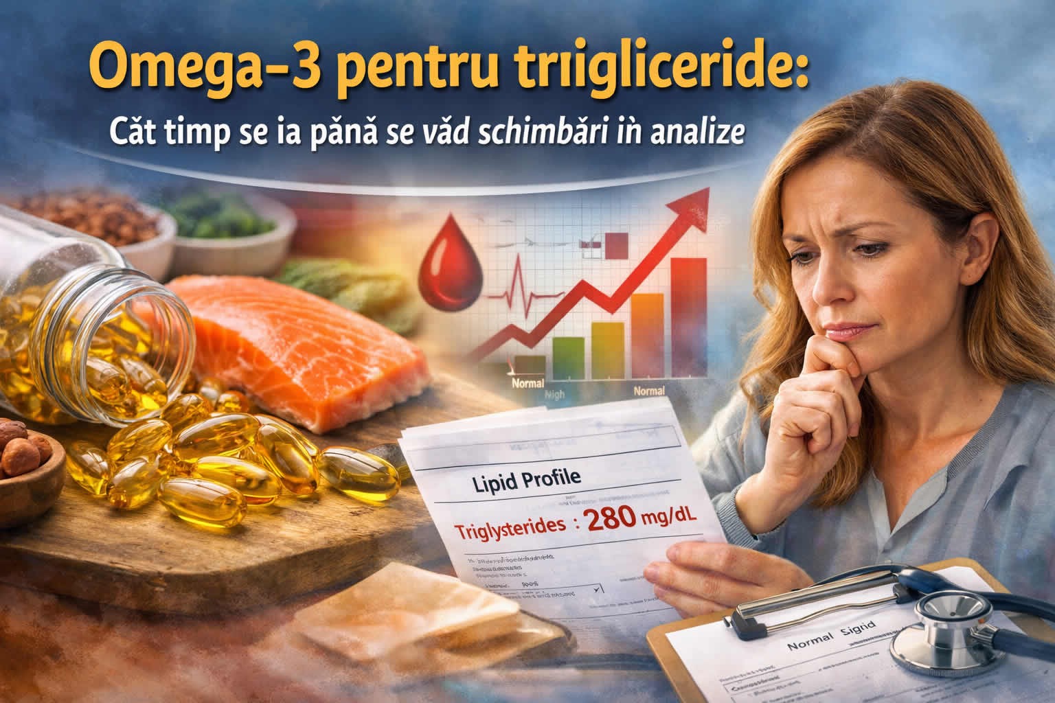 Omega-3 pentru trigliceride este una dintre cele mai căutate opțiuni când analizele ies prost și vrei să știi cât de repede pot apărea schimbări reale. Efectele nu se văd de la o zi la alta, iar rezultatul depinde de doză, tipul de omega-3, constanța administrării și schimbările făcute în paralel în alimentație și stil de viață. În acest articol afli după cât timp merită să repeți analizele, ce așteptări sunt realiste și ce greșeli pot încetini scăderea trigliceridelor.